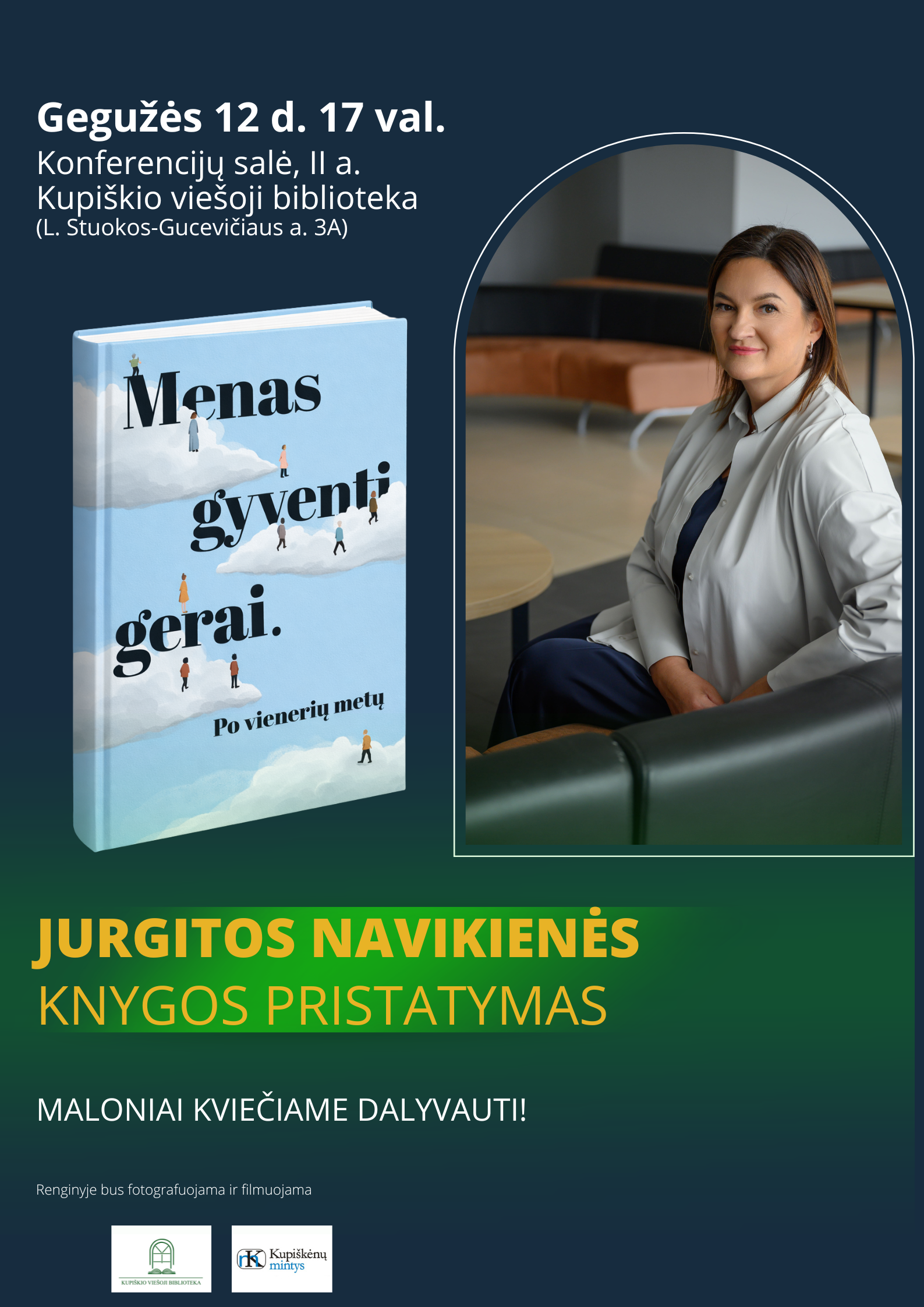2026 04 14Gegužės 12 d. 17 val. bibliotekoje vyks auditorės ir trijų vaikų mamos Jurgitos Navikienės knygos „Menas gyventi gerai. Po vienerių metų“ pristatymas. Pristatymą moderuos žurnalistas Arūnas Limantas.
