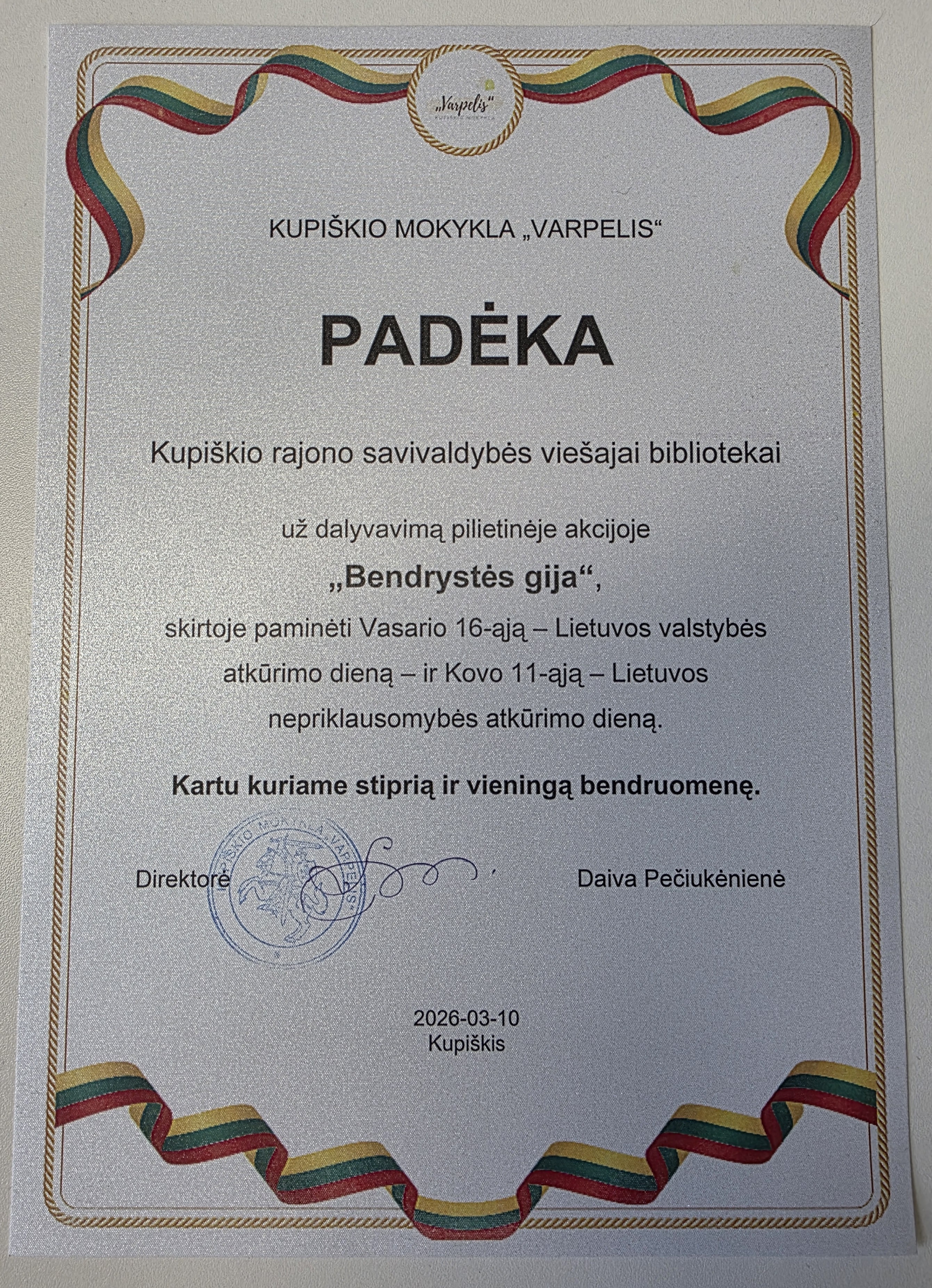 Džiaugiamės ir dėkojame Kupiškio viešosios bibliotekos bibliotekininkei Laimutei Kliopkinienei, Noriūnų padalinio bibliotekininkei Irenai Gasparonienei bei Naivių SAP bibliotekininkei Daivai Tviskuvienei už iniciatyvą ir dalyvavimą pilietinėje ir bendruomeniškumą skatinančioje akcijoje „Bendrystės gija“ skirtoje Vasario 16-ajai – Kovo 11-ajai paminėti.