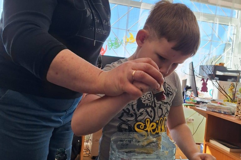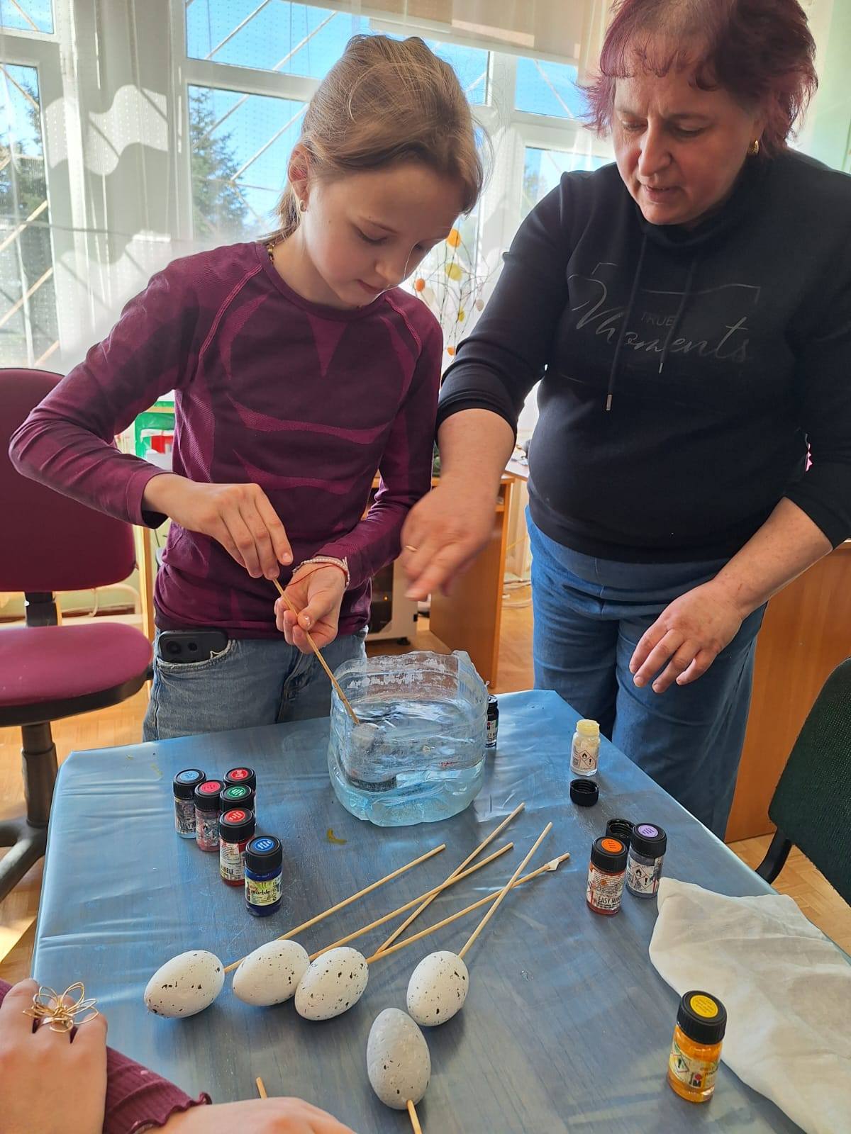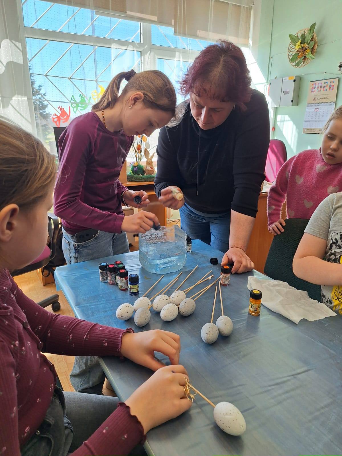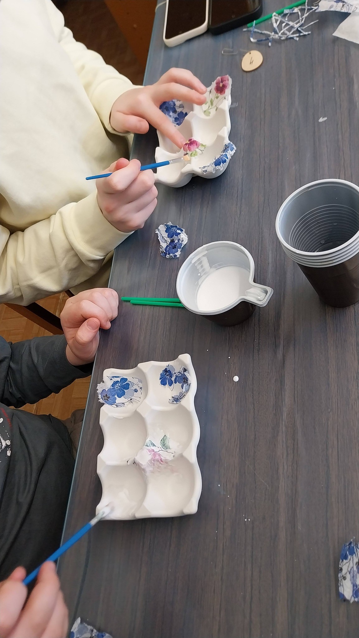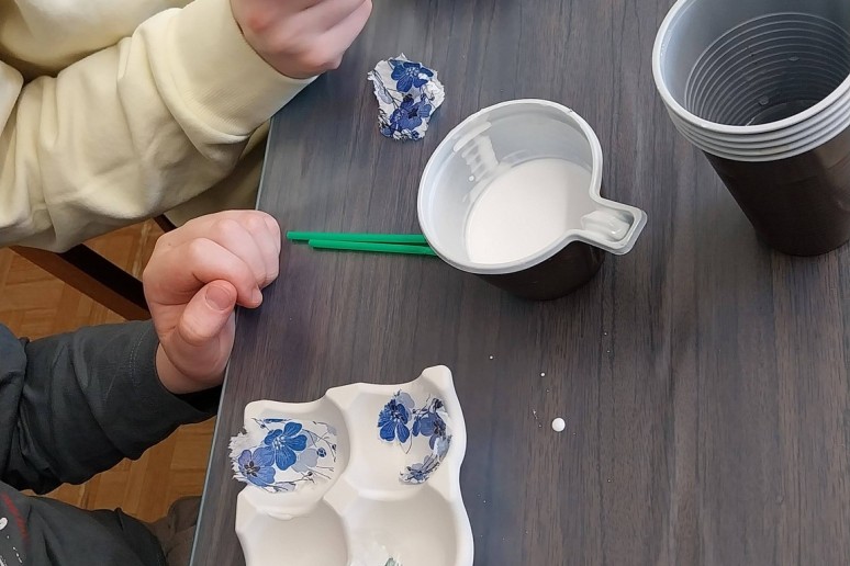 Na, o tada edukatorė Roma supažindino su šios dienos veikla ir kibome į darbus. Ji jau buvo paruošusi dėkliukus kiaušiniams iš gipso, o mums reikėjo juos papuošti. Darbas smagus, bet ne iš lengvųjų.