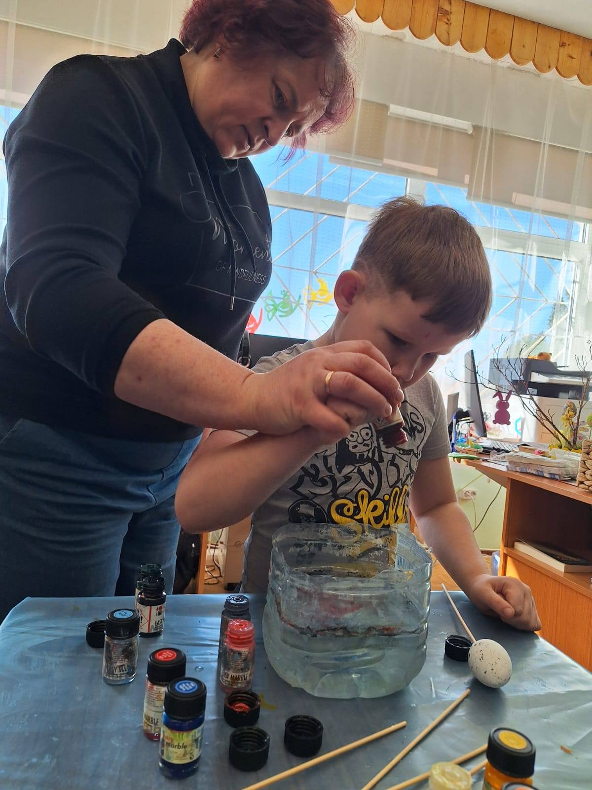 Kol dėkliukai džiūvo, edukatorė Roma, parodė kaip putplaščio kiaušinius numarmuruoti. Čia buvo smagiausias užsiėmimas stebint, kaip kiaušiniai tampa įvairiaspalviais.